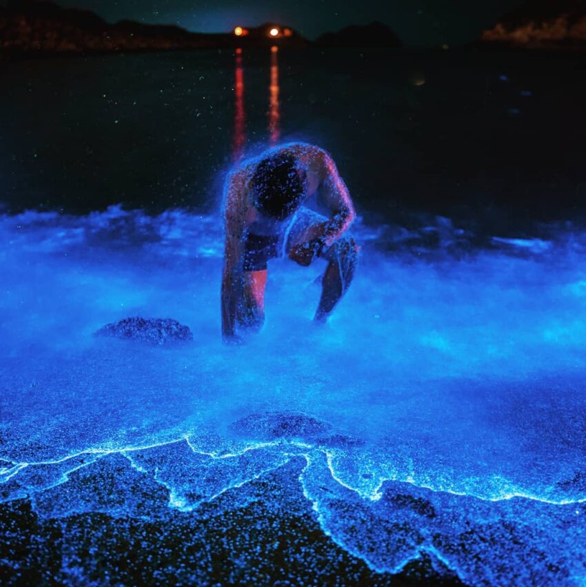 • 靠近潮水邊、海浪或水流較明顯的地方較易觸發螢光。